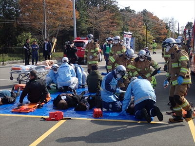 多数傷病者が発生した場合、双葉消防本部の救急車だけでは全ての負傷者を病院まで搬送することは困難であるとともに、直近の医療機関での受入も困難となることから、県内の救急隊やDMATと連携した訓練を継続し、災害への対応力強化を図って参ります。