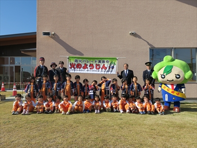 11月9日から11月15日までの間に行われる秋季全国火災予防運動に先駆け、浪江にじいろこども園幼年消防クラブ員が浪江町内の商業施設にて防火パレード等を行い、住民らに火災予防を呼びかけました。